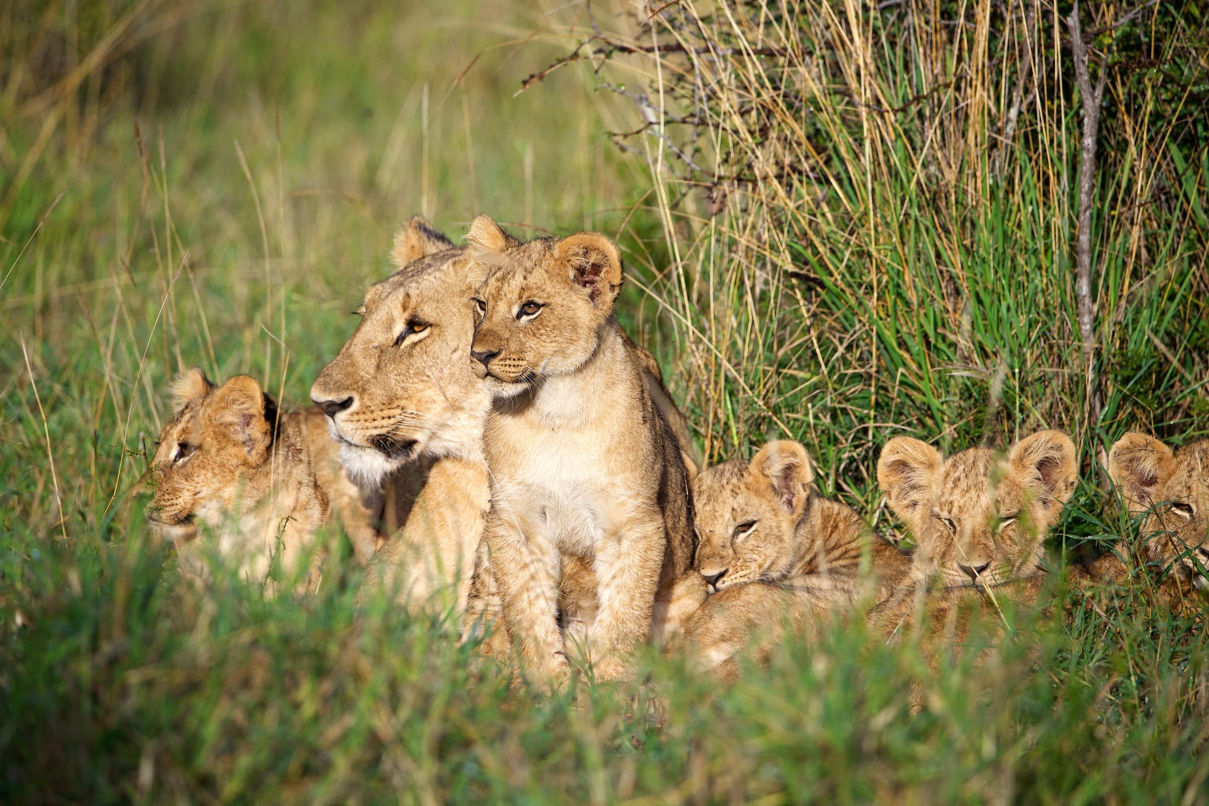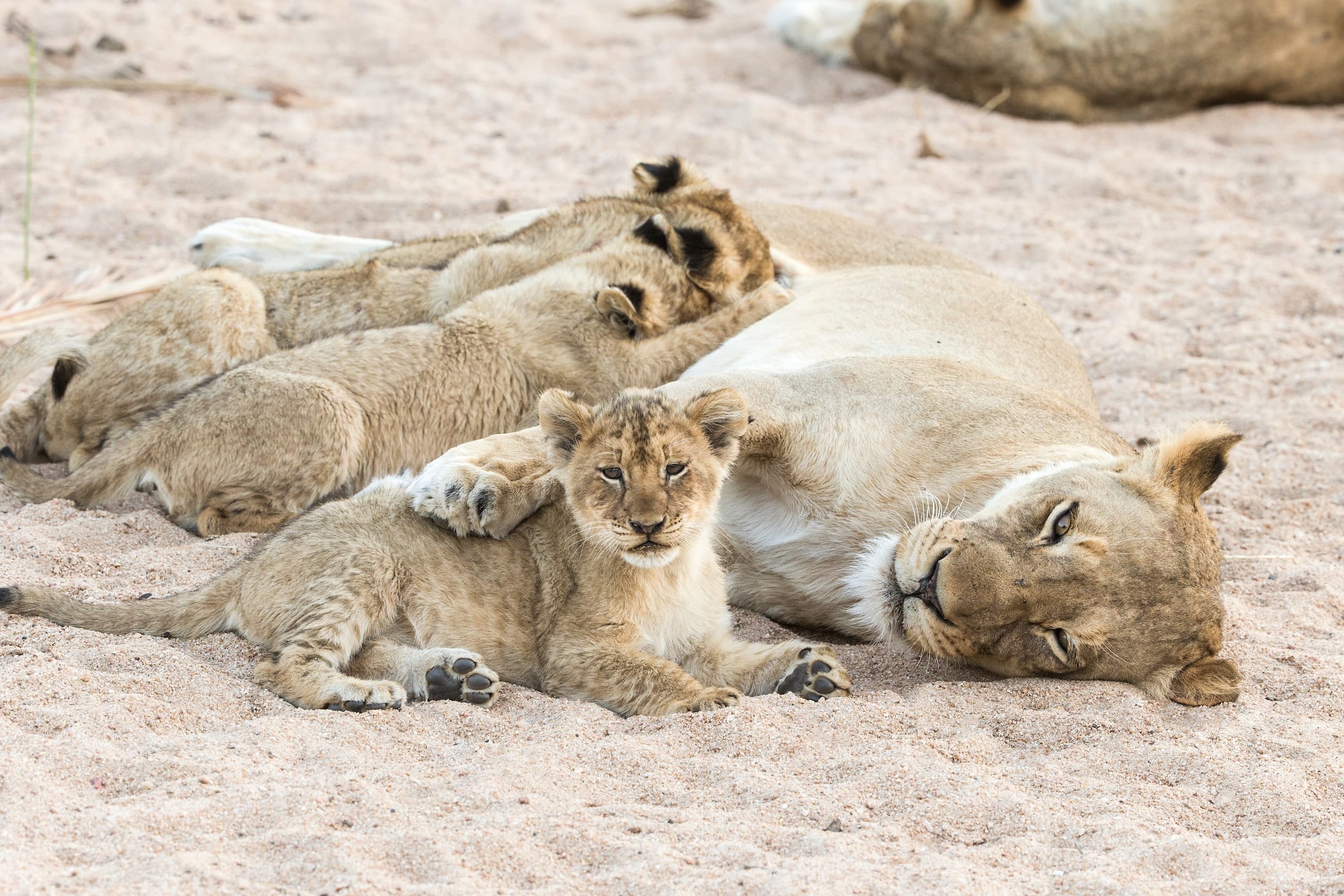 When a group of lionesses give birth within a few months of each other, a nursery group is formed, and pride females provide mutual protection and even nurse each other’s cubs. When a hunt is on, one or two females stay behind to guard the nursery. This social behavior of lionesses pooling their cubs together is mainly a defensive tactic from hyenas and threats made by outside male lions seeking to claim control of the pride.