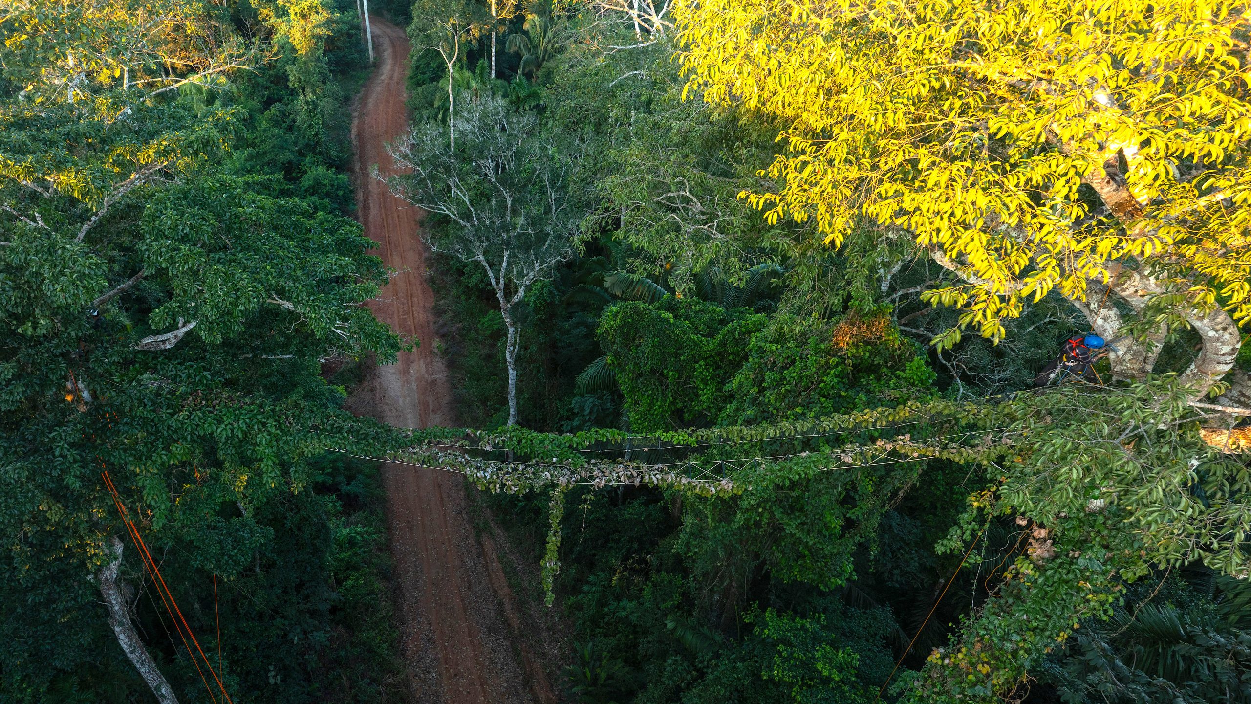 A canopy bridge connecting trees divided by a road.