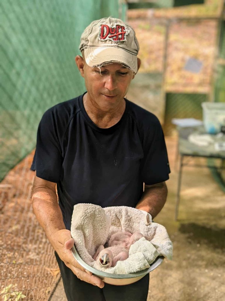 Fabio Castrillo holding a newborn macaw chick in MRN’s Breeding Center.