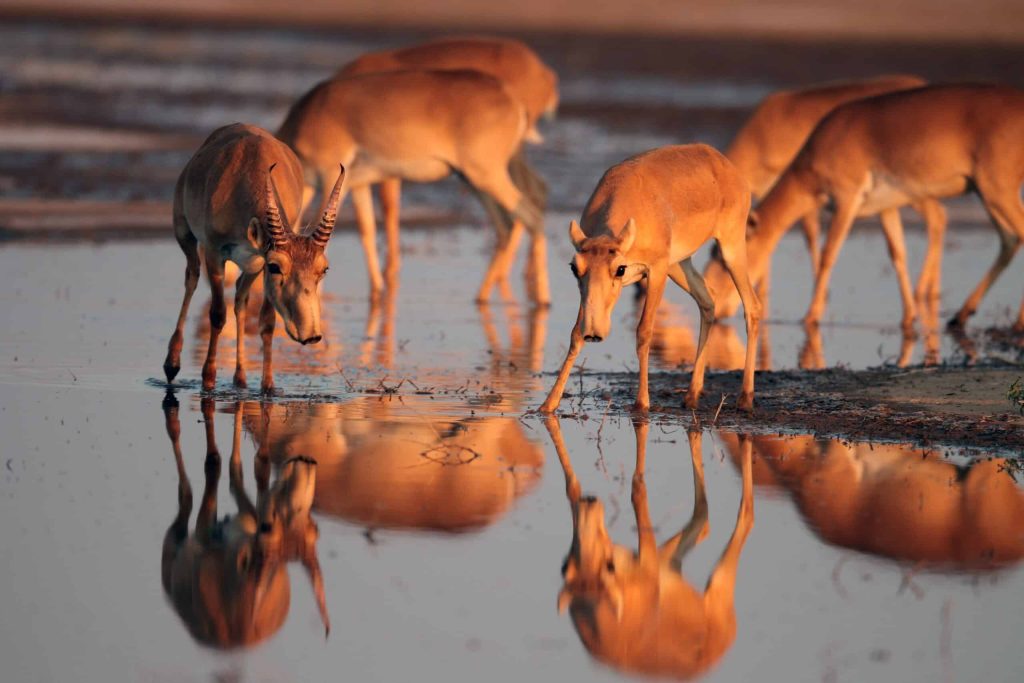 Pale dust plumed as the Saiga Conservation Alliance (SCA) team pulled their vehicles off the main road, arriving at two artesian wells. This water source is one of the few found in what was once Uzbekistan’s Aral Sea, now a vast region of sand and salt. The team looked around, awed by the sight of hundreds of hoofprints surrounding the wells, confirmation that the region’s only herd of Critically Endangered saiga antelope was venturing closer to human-dominated areas to find water. This formerly ruined landscape has recently become the country’s newest protected area, and SCA must now ensure these desert-dwelling saiga have the resources and protection necessary to thrive.