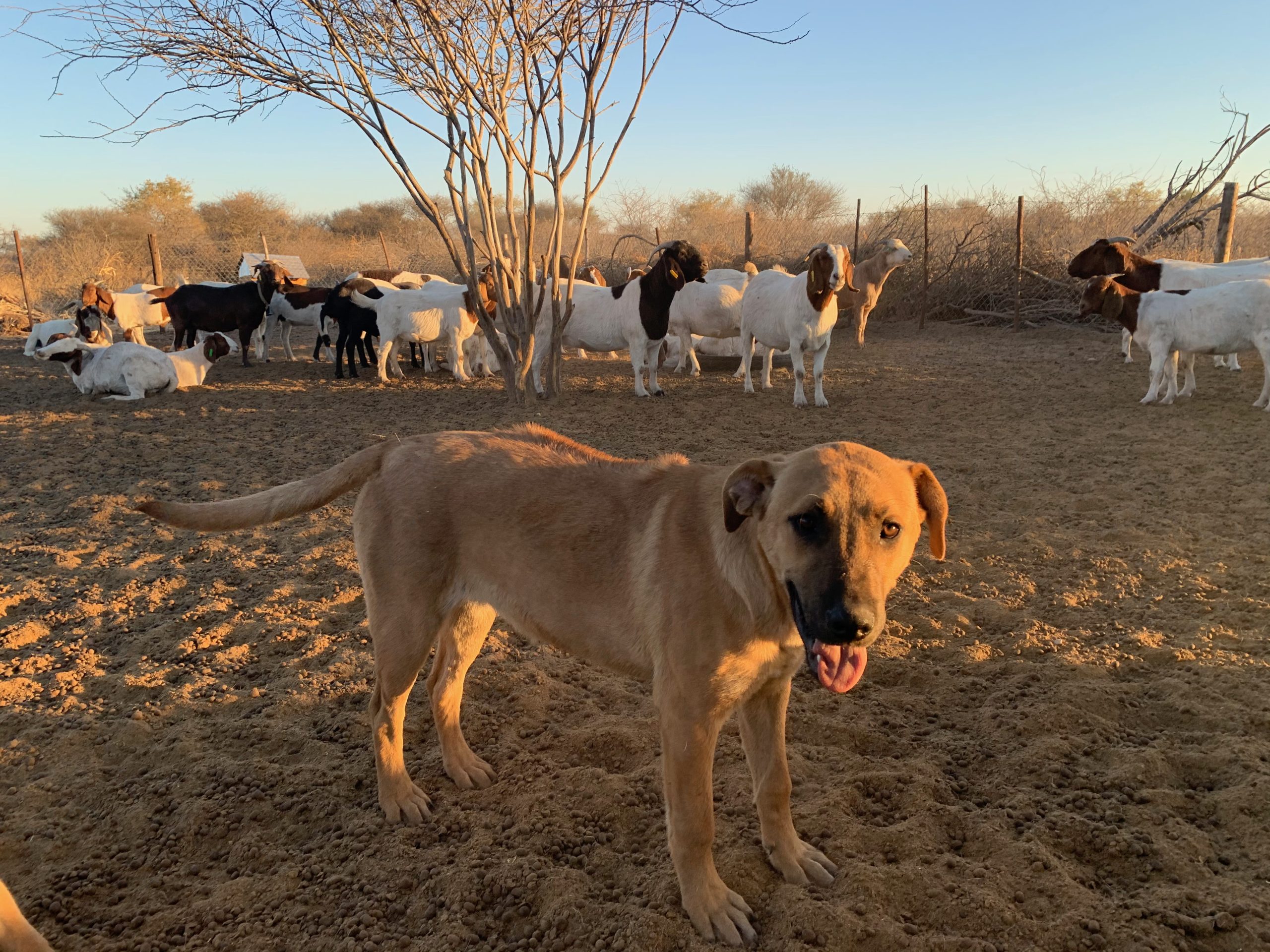 The dogs were already barking when his truck pulled up to the Ghanzi camp. As he left the vehicle, desert dust bloomed from a dozen rushing paws and Max Seele spied tails frantically wagging behind the wooden fence slats. He had arrived at Cheetah Conservation Botswana’s (CCB) demonstration farm, where their livestock guarding dog (LGD) training facility prepares these canines to protect farmers’ livestock and prevent human-cheetah conflict. Max reached over the fence to greet a young Tswana dog, a local variety with a bright future in the program thanks to CCB’s intensive research.
