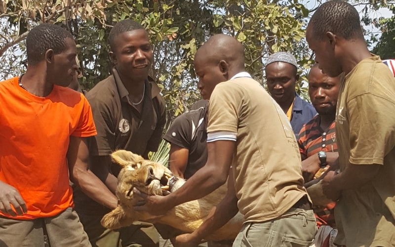 Photo credit: Niassa Lion Project (NLP); Caption: NLP staff carrying Fatima with deep caring and respect after she passed away