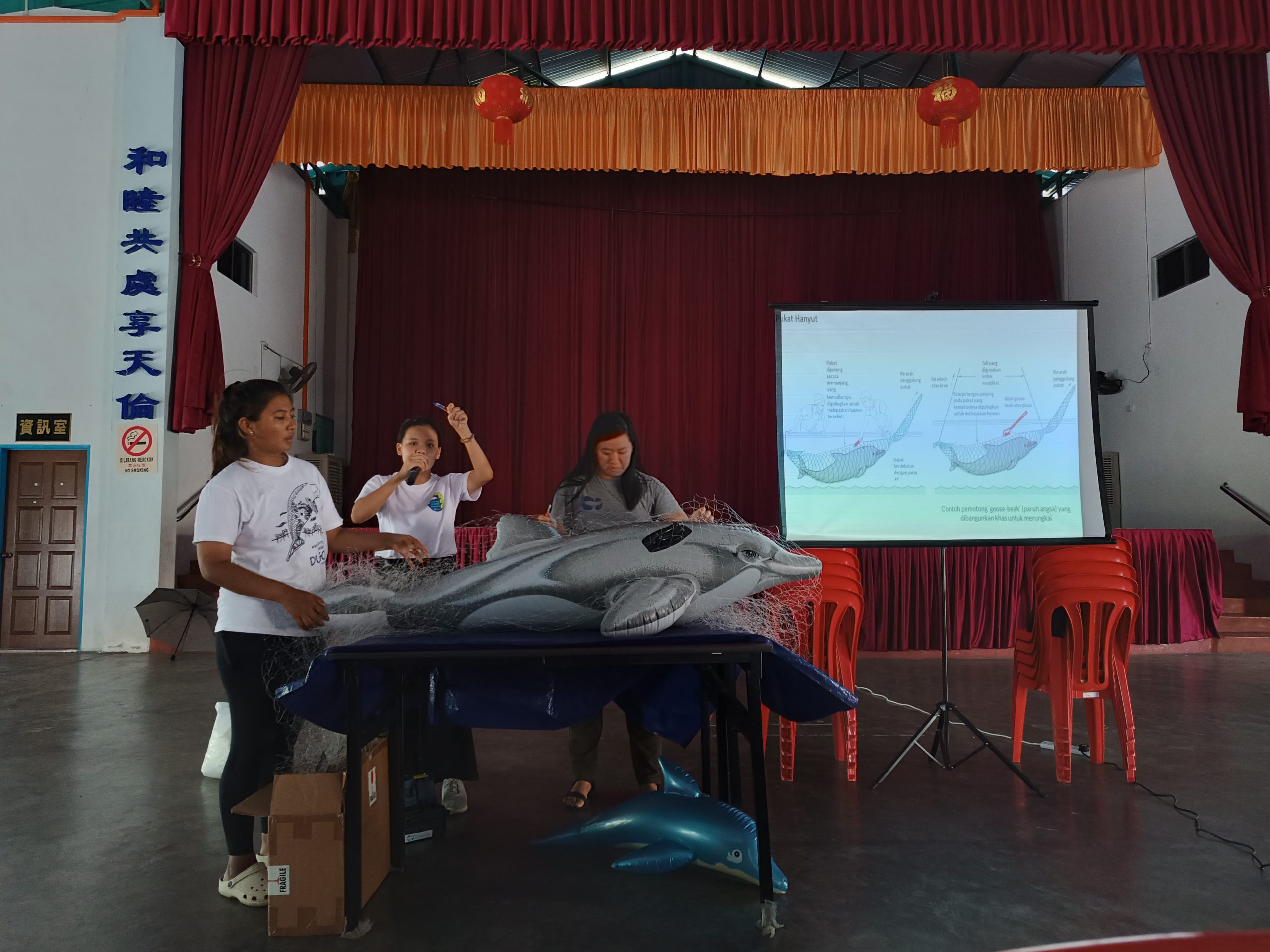 While the actual rate of strandings in Malaysia is unknown, stranding reports have increased in recent years. MareCet hangs informative posters with their contact information throughout coastal communities, so people immediately know who to call whenever a stranded marine mammal is found. But people who call are often too far away for MareCet to reach in person, especially in the event of a time-sensitive live stranding. This is what makes MareCet’s workshops so important—they teach communities how to save stranded marine mammals, or in the event of death strandings, how to contribute to research that supports marine mammal conservation. MareCet also offers video calls to those reporting strandings from faraway locations, to walk them through each step of what to do.