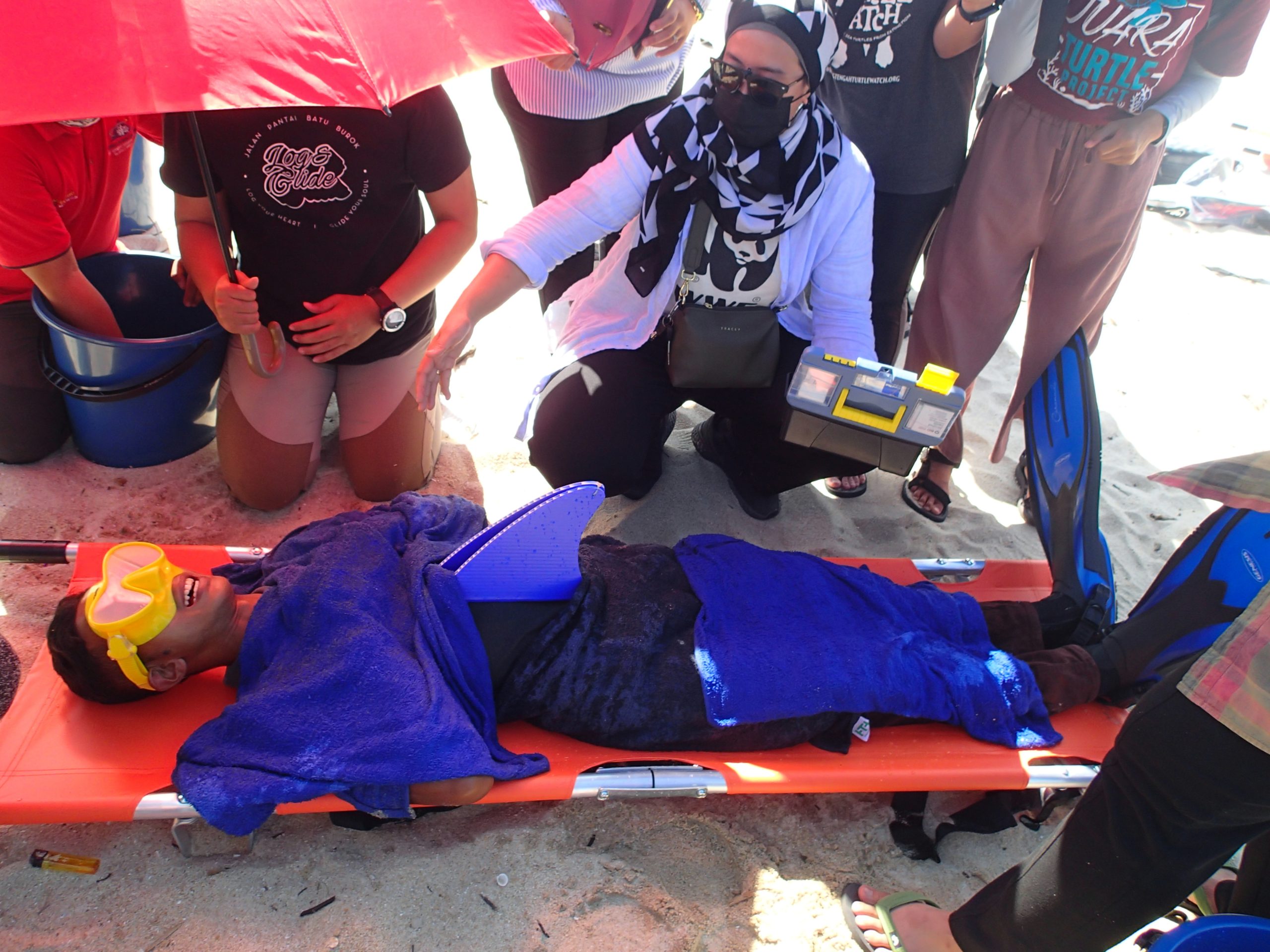 Setting down the life-sized inflatable dolphin, Dr. Vivian Kuit directed the onlookers toward the beach. A volunteer laid supine along the sand, clad in flippers and a fake dorsal fin. Marine mammals often strand themselves along Malaysia’s long coastline, and as a Scientific Officer for MareCet, leading stranding response workshops for locals is one of Vivian’s regular duties. While inflatable dolphins make a good visual, it’s important for workshop participants to understand what lifting a live animal feels like, hence the surrogate dolphin in plastic flippers. As they raised their peer on a makeshift stretcher, Vivian continued the lesson, which equips local people with the necessary skills to save stranded marine mammals.