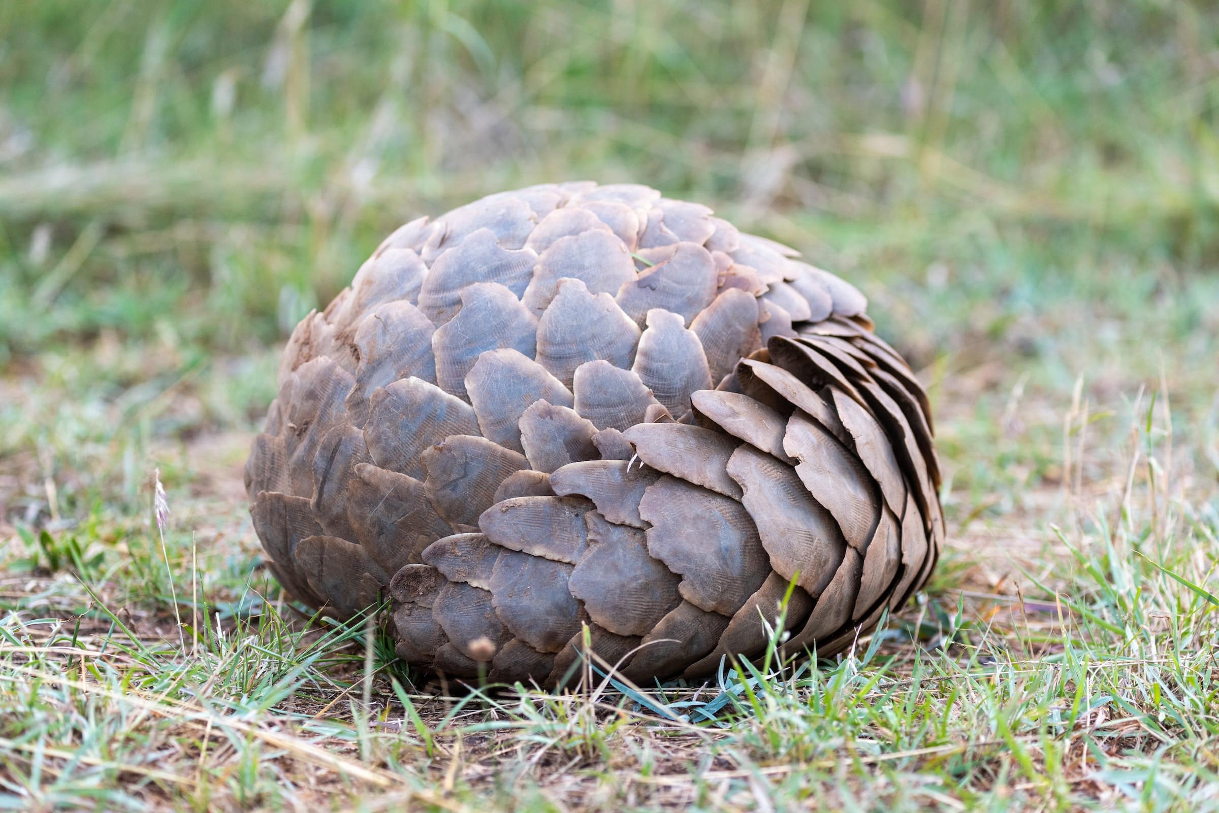Pangolins have long, armored tails that serve them in a variety of ways. This tail is a critical defense mechanism for all pangolins against threats. When pangolins are in danger, their tails tighten and seal them into armored balls, shielding their face and soft underside. Female pangolins keep vulnerable young nestled against their underbelly with their tail wrapped around them when threatened. For females, scaled tails are also a nursery for their young, who cling to them tightly, ready to be quickly wheeled in and guarded against most danger.